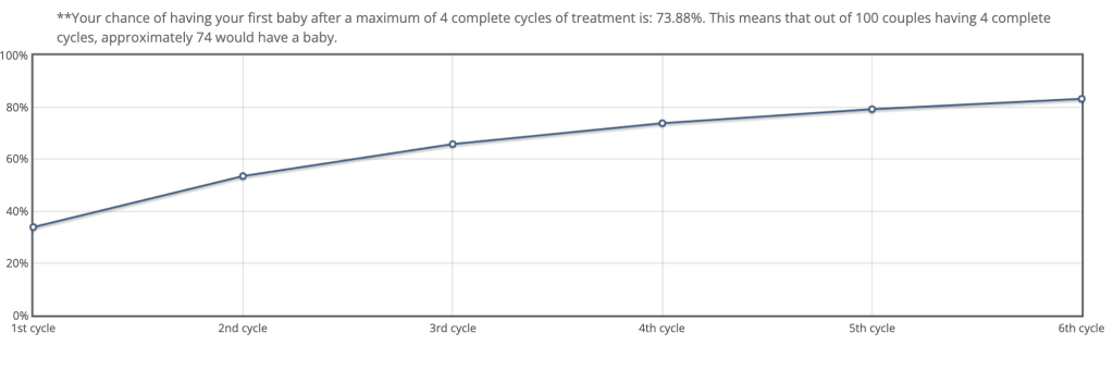 Adarsais is currently looking at communicating success probabilities to women who are thinking of IVF treatment, working with a team at Aberdeen’s medical school which has developed and deployed a predictive tool for this (OPIS). The output of the tool is not a single probability, but rather a time series showing the probability of success (having a baby) after 1, 2, 3, 4, 5, or 6 IVF cycles; see below example from the paper.